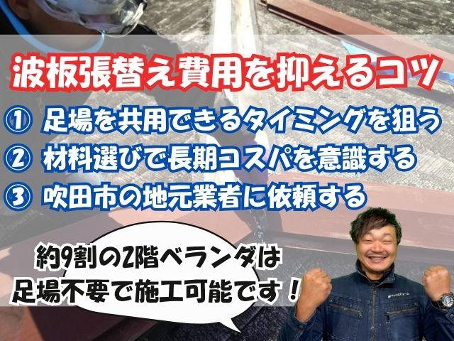 同じ足場を共用すれば、設置・解体費が1回で済むため、総額を数万円単位で節約できます。吹田市では外壁塗装のシーズン(春・秋)に合わせて波板交換を同時依頼する方も多いです。