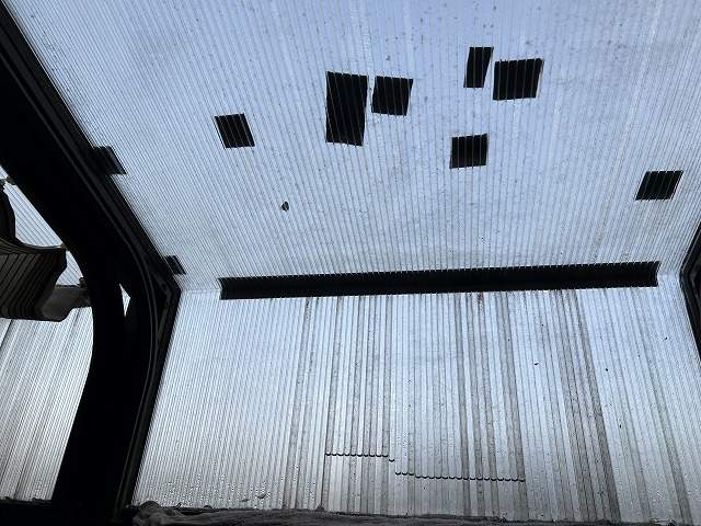既存屋根はガラスネット入り塩ビ波板。すでに劣化が進み、ところどころ割れて水漏れする状態でした。