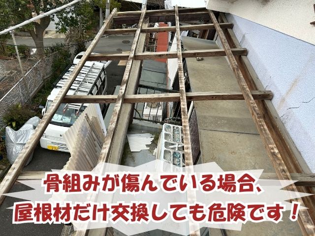 - フレームが弱っている場合は屋根材だけ交換しても危険