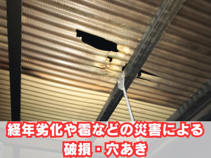 - 危険性: 強度が完全に失われており、わずかな衝撃(雹など)で簡単に穴があき、大雨や雨漏りにつながります。