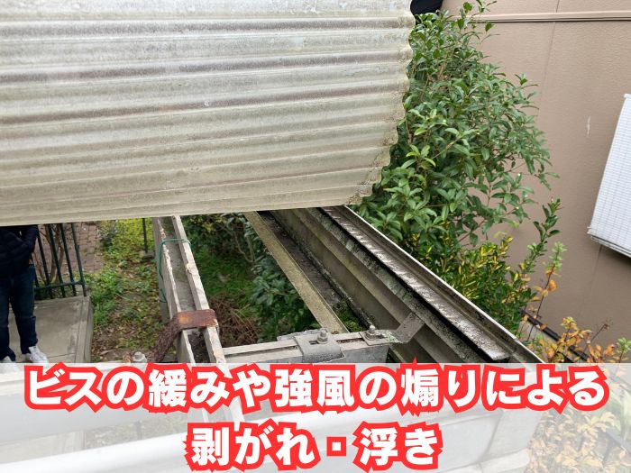 フックの留めが緩んだり、強風の煽りを受けたりして、波板がフレームから部分的に外れたり、浮き上がったりしている状態です。