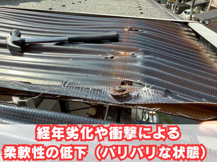 新しい波板には柔軟性がありますが、劣化が進むと素材が硬化し、弾力性が失われます。