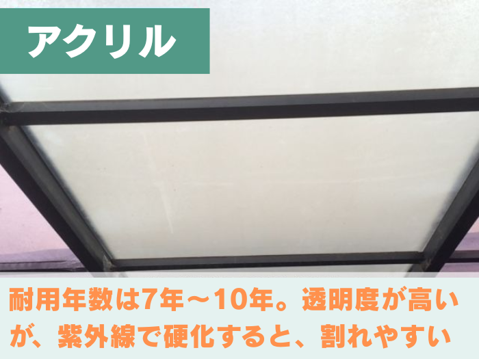 20〜30年前のベランダ屋根やカーポートで主流だった素材です。透明感はありますが、衝撃に弱く、劣化すると「パリン」と鋭利に割れて落下してくるため、現代の安全基準では推奨されません。