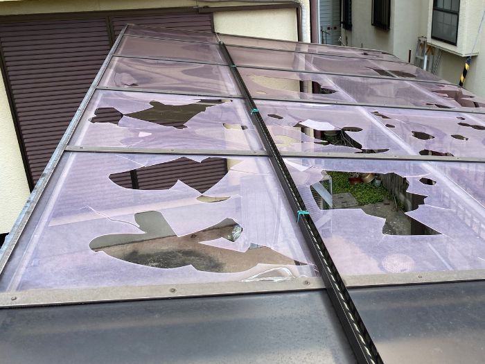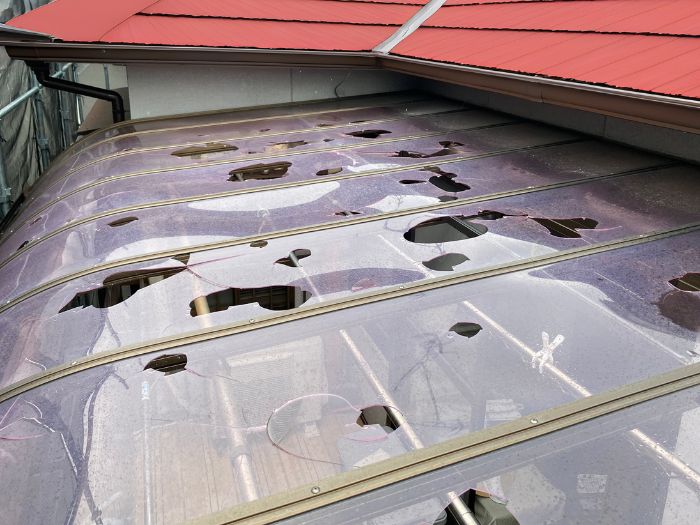 - 発生状況: 季節外れの強い雹が降った際、カーポートの屋根全体に複数の小さな穴やひび割れが発生し、雨漏りの懸念が生じた。