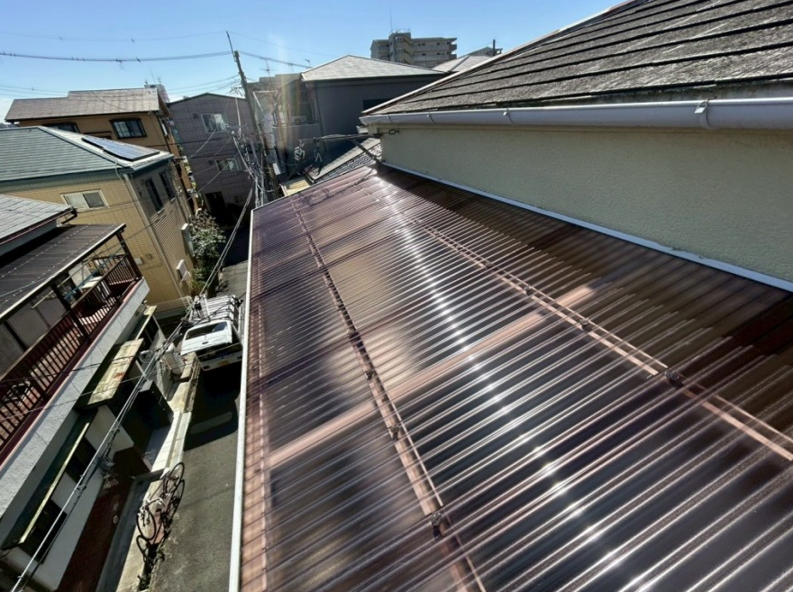 残っている波板も硬化・劣化が進んでいたため、部分補修ではなく全面張替えが最適と判断しました。