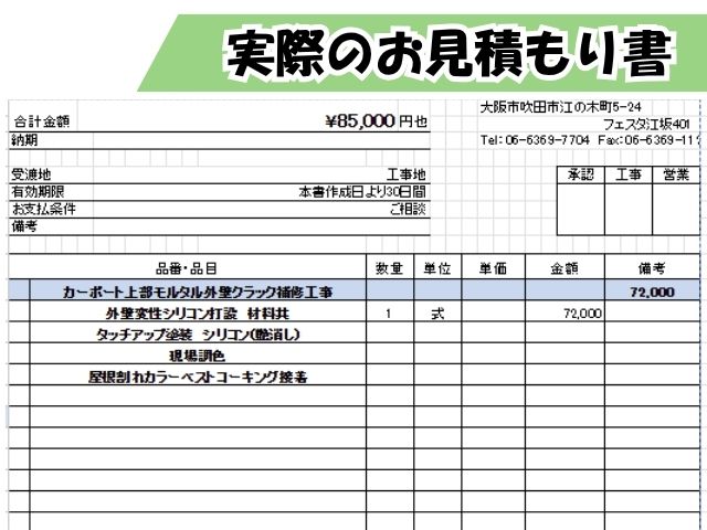 | カーポート上部モルタル外壁クラック補修工事 | 72,000円 |